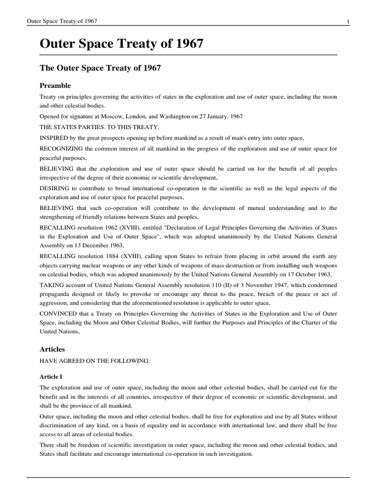 Outer Space Treaty Full Text at Victoria Palmer blog Outer Space Treaty learn about the outer space treaty, an international agreement that governs how nations act in space and prevents nuclear weapons in orbit. the treaty prohibits the placement of nuclear weapons and other weapons of mass destruction in outer space and on celestial. learn about the 1967 treaty that prohibits nuclear weapons and sovereignty claims in space, and. Outer Space Treaty.